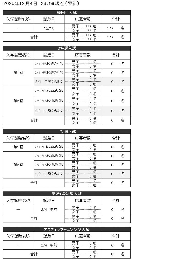 HOME/トピックス/入試関係/【中学入試】出願状況(12月4日 23:59現在) 【中学入試】出願状況(12月4日 23:59現在) 入試関係 2025.12.05 #中学入試 PREV 【入試関係】創英ゼミナール『 SOUEIタイムス 』で本校が紹介されました! NEXT 【重要】帰国生入試当日のご案内とお願い CATEGORY 最新情報 行事 入試関係 部活 進路 事務連絡 KEYWORD TAG #学校説明会#社会科#国語科#教科の取り組み#男子硬式テニス部#公共#太鼓部#メディア掲載#模擬国連#東京大学見学会#外部コンテスト#理科部#スピーチコンテスト#宿泊行事#レシテーションコンテスト#合唱コンクール#体育行事#TRF#勉強合宿#アートマイル#ロイロノート#英語行事#陸上競技部#陸上部#歌舞伎教室#筑波大学見学ツアー#研究論文#校外学習#茶道部#筝曲部#インターアクト・ボランティア委員会#日経STOCKリーグ#休校#バドミントン部#トピックス#ますみ会#留学#中学女子バレー部#音楽#中学女子バスケットボール部 ARCHIVE 2025 12月(10) 11月(16) 10月(10) 9月(24) 8月(14) 7月(7) 6月(20) 5月(11) 4月(23) 3月(7) 2月(17) 1月(15) 2024 12月(15) 11月(26) 10月(14) 9月(28) 8月(21) 7月(7) 6月(14) 5月(10) 4月(12) 3月(2) 2月(24) 1月(10) 2023 12月(7) 11月(28) 10月(14) 9月(28) 8月(11) 7月(12) 6月(14) 5月(14) 4月(4) 3月(7) 2月(11) 1月(11) 2022 12月(3) 11月(17) 10月(9) 9月(13) 8月(17) 7月(6) 6月(16) 5月(9) 4月(14) 3月(15) 2月(12) 1月(5) 2021 12月(3) 11月(21) 10月(8) 9月(12) 8月(6) 7月(8) 6月(10) 5月(13) 4月(19) 3月(7) 2月(9) 1月(1) 2020 12月(3) 11月(4) 10月(5) 9月(9) 8月(7) 7月(4) 6月(3) 5月(7) 4月(1) 3月(4) 2月(13) 1月(6) 2019 12月(4) 11月(10) 10月(5) 9月(12) 8月(6) 7月(10) 6月(9) 5月(5) 4月(15)