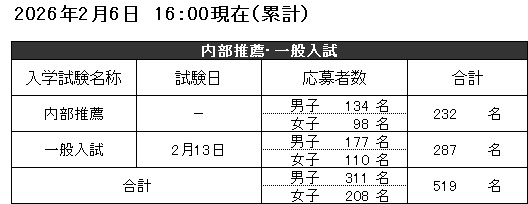 HOME/トピックス/入試関係/【高校入試】出願状況(2月6日 16:00現在) 【高校入試】出願状況(2月6日 16:00現在) 入試関係 2026.02.07 #高校入試 PREV 【中学】2/4 受験入試結果速報 NEXT 高校入試 合格発表について CATEGORY 最新情報 行事 入試関係 部活 進路 事務連絡 KEYWORD TAG #学校説明会#社会科#国語科#教科の取り組み#男子硬式テニス部#公共#太鼓部#メディア掲載#模擬国連#東京大学見学会#外部コンテスト#理科部#スピーチコンテスト#宿泊行事#レシテーションコンテスト#合唱コンクール#体育行事#TRF#勉強合宿#アートマイル#ロイロノート#英語行事#陸上競技部#陸上部#歌舞伎教室#筑波大学見学ツアー#研究論文#校外学習#茶道部#筝曲部#インターアクト・ボランティア委員会#日経STOCKリーグ#休校#バドミントン部#トピックス#ますみ会#留学#中学女子バレー部#音楽#中学女子バスケットボール部 ARCHIVE 2026 2月(15) 1月(13) 2025 12月(15) 11月(16) 10月(10) 9月(24) 8月(14) 7月(7) 6月(20) 5月(11) 4月(23) 3月(7) 2月(17) 1月(15) 2024 12月(15) 11月(26) 10月(14) 9月(28) 8月(21) 7月(7) 6月(14) 5月(10) 4月(12) 3月(2) 2月(24) 1月(10) 2023 12月(7) 11月(28) 10月(14) 9月(28) 8月(11) 7月(12) 6月(14) 5月(14) 4月(4) 3月(7) 2月(11) 1月(11) 2022 12月(3) 11月(17) 10月(9) 9月(13) 8月(17) 7月(6) 6月(16) 5月(9) 4月(14) 3月(15) 2月(12) 1月(5) 2021 12月(3) 11月(21) 10月(8) 9月(12) 8月(6) 7月(8) 6月(10) 5月(13) 4月(19) 3月(7) 2月(9) 1月(1) 2020 12月(3) 11月(4) 10月(5) 9月(9) 8月(7) 7月(4) 6月(3) 5月(7) 4月(1) 3月(4) 2月(13) 1月(6) 2019 12月(4) 11月(10) 10月(5) 9月(12) 8月(6) 7月(10) 6月(9) 5月(5) 4月(15)