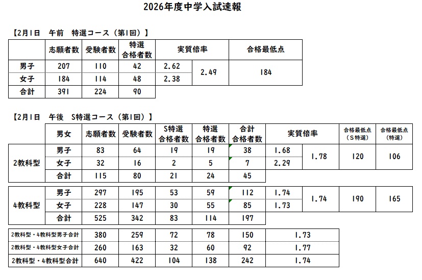 HOME/トピックス/入試関係/【中学】2/1 受験入試結果速報 【中学】2/1 受験入試結果速報 入試関係 2026.02.02 #中学入試 PREV 【中学入試】合格発表について NEXT 【中学】2/2 受験入試結果速報 CATEGORY 最新情報 行事 入試関係 部活 進路 事務連絡 KEYWORD TAG #学校説明会#社会科#国語科#教科の取り組み#男子硬式テニス部#公共#太鼓部#メディア掲載#模擬国連#東京大学見学会#外部コンテスト#理科部#スピーチコンテスト#宿泊行事#レシテーションコンテスト#合唱コンクール#体育行事#TRF#勉強合宿#アートマイル#ロイロノート#英語行事#陸上競技部#陸上部#歌舞伎教室#筑波大学見学ツアー#研究論文#校外学習#茶道部#筝曲部#インターアクト・ボランティア委員会#日経STOCKリーグ#休校#バドミントン部#トピックス#ますみ会#留学#中学女子バレー部#音楽#中学女子バスケットボール部 ARCHIVE 2026 2月(6) 1月(13) 2025 12月(15) 11月(16) 10月(10) 9月(24) 8月(14) 7月(7) 6月(20) 5月(11) 4月(23) 3月(7) 2月(17) 1月(15) 2024 12月(15) 11月(26) 10月(14) 9月(28) 8月(21) 7月(7) 6月(14) 5月(10) 4月(12) 3月(2) 2月(24) 1月(10) 2023 12月(7) 11月(28) 10月(14) 9月(28) 8月(11) 7月(12) 6月(14) 5月(14) 4月(4) 3月(7) 2月(11) 1月(11) 2022 12月(3) 11月(17) 10月(9) 9月(13) 8月(17) 7月(6) 6月(16) 5月(9) 4月(14) 3月(15) 2月(12) 1月(5) 2021 12月(3) 11月(21) 10月(8) 9月(12) 8月(6) 7月(8) 6月(10) 5月(13) 4月(19) 3月(7) 2月(9) 1月(1) 2020 12月(3) 11月(4) 10月(5) 9月(9) 8月(7) 7月(4) 6月(3) 5月(7) 4月(1) 3月(4) 2月(13) 1月(6) 2019 12月(4) 11月(10) 10月(5) 9月(12) 8月(6) 7月(10) 6月(9) 5月(5) 4月(15)